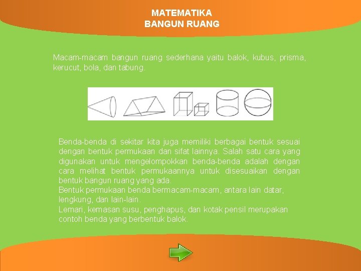 Bangun ruang ini hanya memiliki satu buah sisi berbentuk lengkungan yang memiliki jarak yang sama dengan sebuah titik tengah contoh benda bangun ruang. Bagi yang belum dapat menyebutkan contoh benda bangun ruang sisi lengkung .